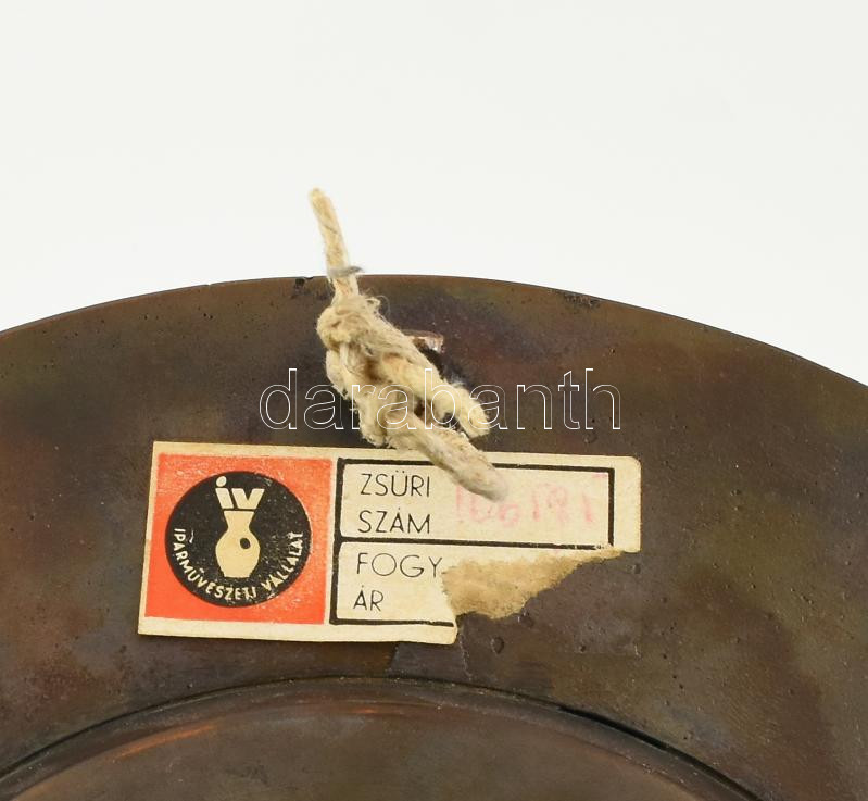 NL jelzéssel: Iparművész vörösréz tál figurális relieffel, hátoldalán az Iparművészeti Vállalat zsűri címkéjével, d: 21 cm