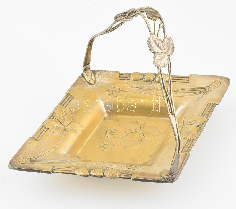 Szecessziós, ezüstözött alpakka füles kínáló, epres-virágos díszítéssel. Jelzett, kopott, 33,5x24 cm