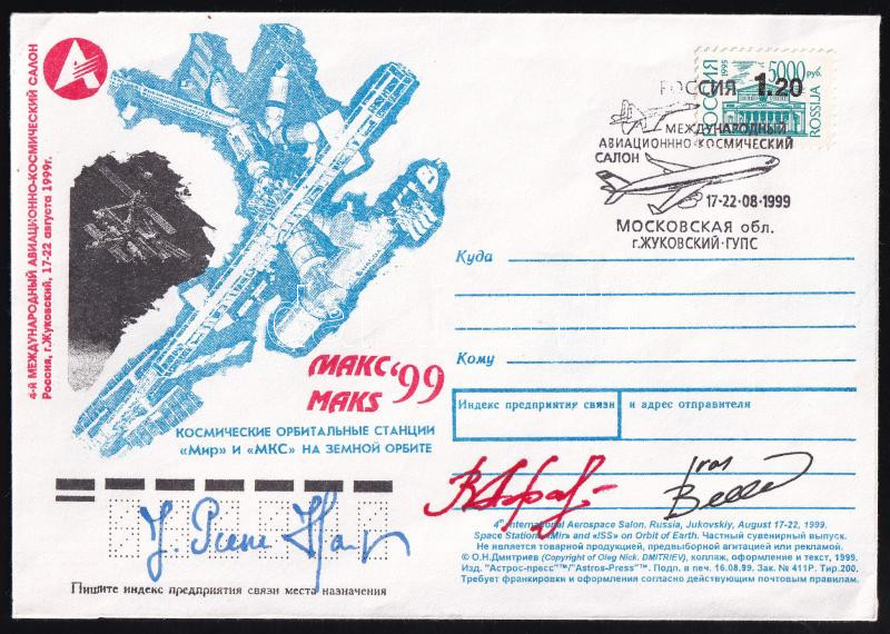 Description: Jean-Pierre Haigneré (1948- ) francia, Ivan Bella (1964-) szlovák és Viktor Afanaszjev (1948- ) orosz űrhajósok aláírásai emlékborítékon / Signatures of Jean-Pierre Haigneré (1948- ) French, Ivan Bella (1964-) Slovakian and Viktor Afanasyev (1948- ) Russian astronauts on envelope