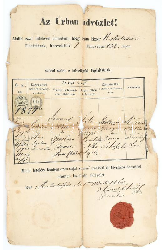 https://www.darabanth.com/en/436-Online-auction/436.0/Art-and-other-collectibles/Documents~500018/1860-Martonvasar-keresztlevel-30-kr-es-6-kr-okmanybelyeggel-viaszpecsettel-serult-kiss~II2836784