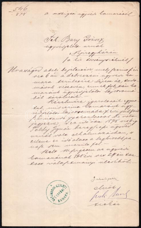 1878 Máramarosszigeti ügyvédi kamara által kiadott igazolás