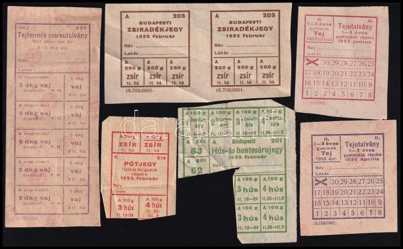 cca 1952 Budapesti zsír-, hús és tejtermék jegyek, 7 db