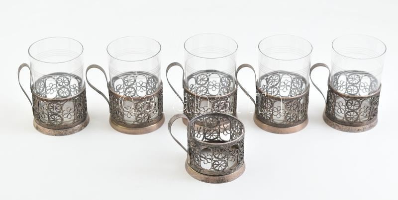 Ezüstözött filigrán pohár készlet, 6 db, egyikből az üveg hiányzik, kopott, jelzett, m: 10,5 cm
