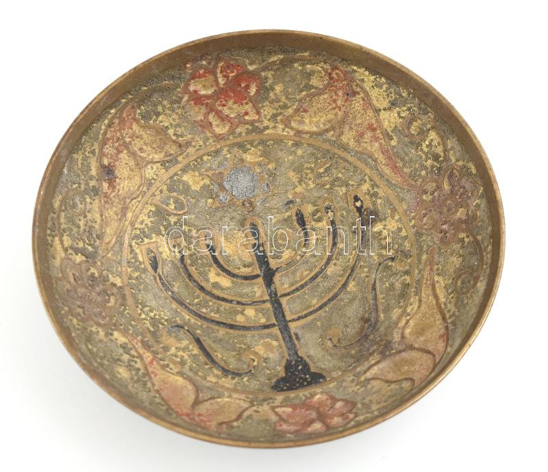 Réz tálka menórás zománc díszítéssel. Kopott 8 cm