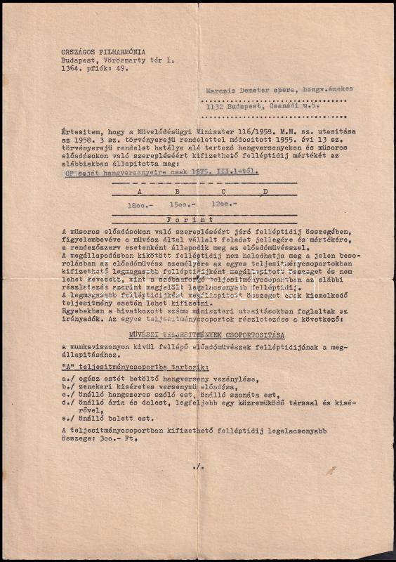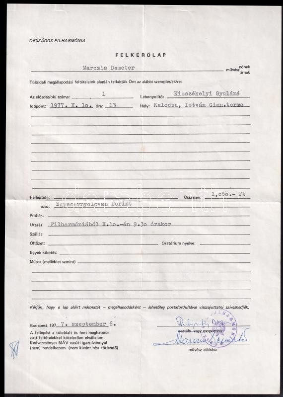 1975-1978 Országos Filharmónia felkérőlap ill. fellépési díjmegállapítás, Marczis Demeter operaénekes, a Pécsi Nemzeti Színház tagja részére + Pécsi Nemzeti Színház 1977-78-as műsorfüzet, aláírásokkal