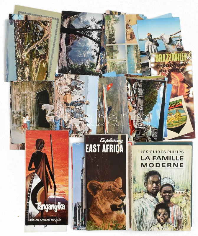 Régebbi afrikai utazási prospektusok, könyv, képeslapok, bőröndcímke (Etiópia, Kongó, Kenya, stb.), össz. 30-40 db