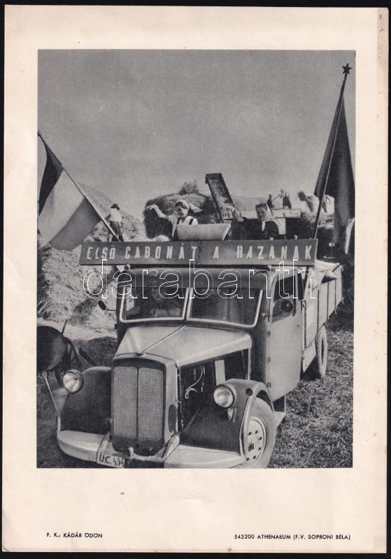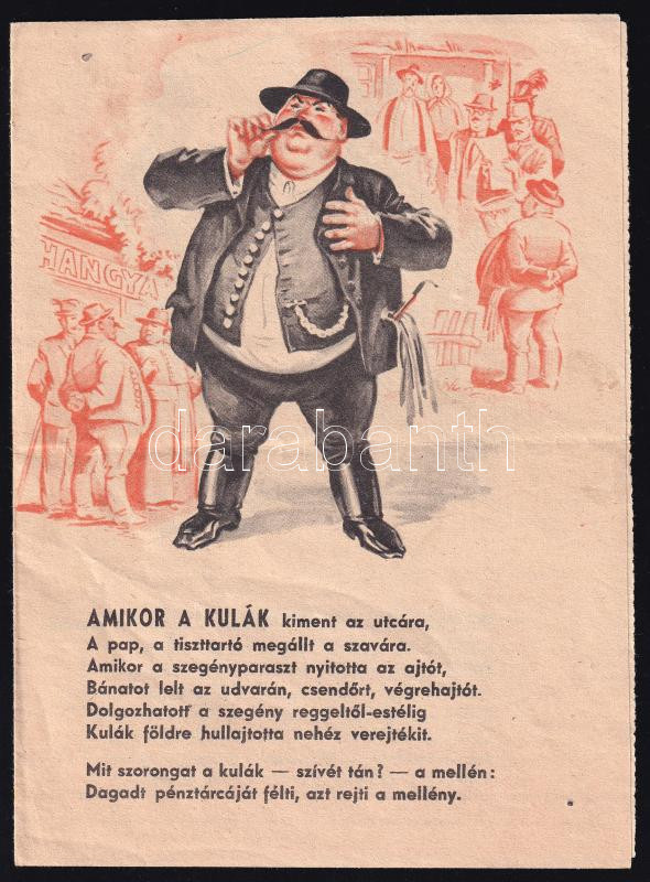 cca 1950-55 2 db kommunista propaganda nyomtatvány: "Első gabonát a hazának", illusztrált egyoldalas kép, 24x17 cm + "Amikor a kulák kiment az utcára (...)", verses szövetkezeti nyomtatvány, Pál György (1906-1986) grafikus illusztrációival, 4 sztl. oldal, kiadja a M.O.Sz.K. propaganda osztálya, hajtásnyommal, 20x15 cm