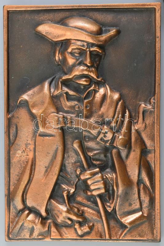 Jelzés nélkül: Pipázó juhász. Bronzírozott fém dombormű, falikép, 27x17 cm