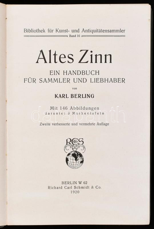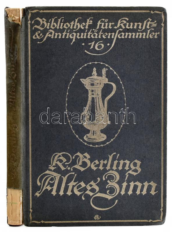 Description: Berling, Karl: Altes Zinn. Ein Handbuch für Sammler und Liebhaber. Bibliothek für Kunst- und Antiquitätensammler Band 16. Berlin, 1920, Richard Carl Schmidt & Co. Fekete-fehér képekkel illusztrálva. Német nyelven. Kiadói egészvászon-kötés, sérült, kissé hiányos gerinccel