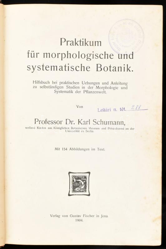 Description: Karl Schumann: Praktikum für Morphologische und Systematische Botanik. Hilfsbuch bei Praktischen Uebungen und Anleitung zu Selbständigen Studien in der Morphologie und Systematik der Pflanzenwelt. Jena, 1904, Gustav Fischer, VIII+610 p. Szövegközti rajzokkal illusztrált. Korabeli átkötött félbőr-kötésben, javított gerinccel, kopott borítóval.
