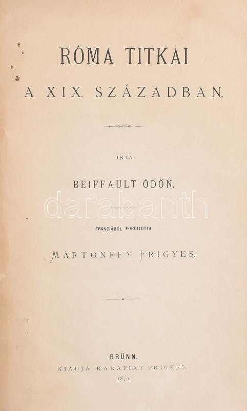 Beiffault Ödön: Róma titkai a XIX. században. Ford.: Mártonffy Frigyes... https://www.darabanth.com/en/436-Online-auction/436.0/Books/Books-History~1000009/Beiffault-Odon-Roma-titkai-a-XIX-szazadban-Ford-Martonffy-Frigyes-Brunn-1870-Karafiat~II2788277