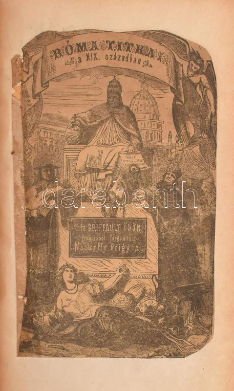 Description: Beiffault Ödön: Róma titkai a XIX. században. Ford.: Mártonffy Frigyes. Brünn, 1870., Karafiat Frigyes, 1 (díszcímlap) t. + 4+448 p.+20 (fametszetű képtáblák) t. Szövegközti fametszetű illusztrációkkal. Átkötött félvászon-kötés, a borítón címkenyomokkal, benne foltos lapokkal is, javításnyomokkal.