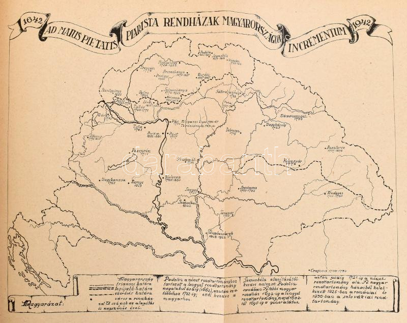 Description: Dr. Balanyi György-Bíró Imre-Dr. Bíró Vencel-Dr. Tomek Vince: A magyar piarista rendtartomány története. Bp.,1943, Magyar Kegyes Tanítórend,(Stephaneum-ny.), 373+2 p.+1 kihajtható térképpel. Kiadói papírkötésben, kissé foltos borítóval, két lap és a térkép kijár.