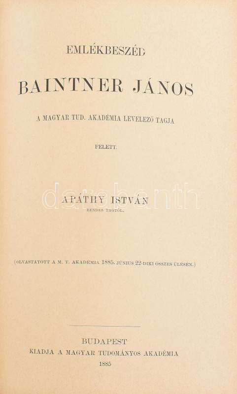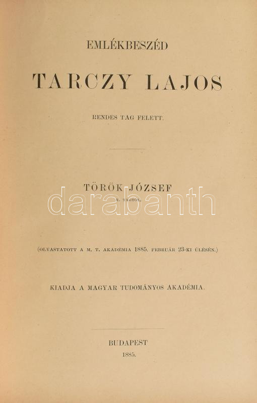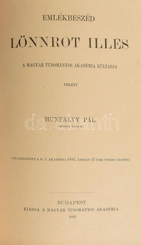 Emlékbeszédek a M.T.Akadémia elhúnyt tagjai fölött. II. köt: Haynald Lajos: Fenzl Ede, Thank Károly: Sainte-Claire Deville Henrik, Trefort Ágoston: Mignet Ferenc, Török József: Tarczy Lajos, Hunfalvy Pál: Lönnrot Illés, Apáthy István: Baintner János, Trefort Ágoston: Guizot Ferenc, Pauer Imre: Horváth Cyrill, Lenhossék József: Davis József Bernát, Vécsey Tamás: Vandrák András, Budenz József: Benfey Tivadar, Vadnai Károly: Frankenburg Adolf, Szvorényi József: Tárkányi Béla József, Mihalkovics Géza: Henle Jakab, Joannovics György: Pompéry János, Szilágyi Sándor: Gyárfás István. Vadnai Károly: Kovács Pál, Szabó Károly: Ladányi Gedeon, Galgóczy Károly: Korizmics László. Szerk.: a Főtitkár. Bp., 1885-1887, MTA. Átkötött félvászon-kötés, kopott borítóval, a gerincen címkével, intézményi bélyegzőkkel, a tartalomjegyzékben jelölt 10 számból csak az utolsó 3 van meg (Fenzl Ede, Sainte-Claire Deville Henrik, Mignet Henrik), viszont a többit nem jelöli a tartalomjegyzék.