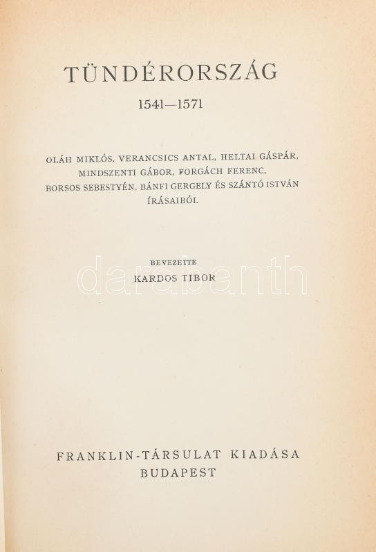 Erdély öröksége. Erdélyi emlékírók Erdélyről. I köt. Cs. Szabó László közreműködésével szerk. Makkai László. Ravasz László bevezetésével. I. köt.: Tündérország. 1541-1571. Oláh Miklós, Verancsics Antal, Heltai Gáspár, Mindszenti Gábor, Forgách Ferenc, Borsos Sebestyén, Bánfi Gergely és Szántó István írásaiból. Kardos Tibor bevezetésével. Bp., [1941.],Franklin, XXXIV+164+1 p.Kiadói, címeres papírkötésben, kissé sérült.