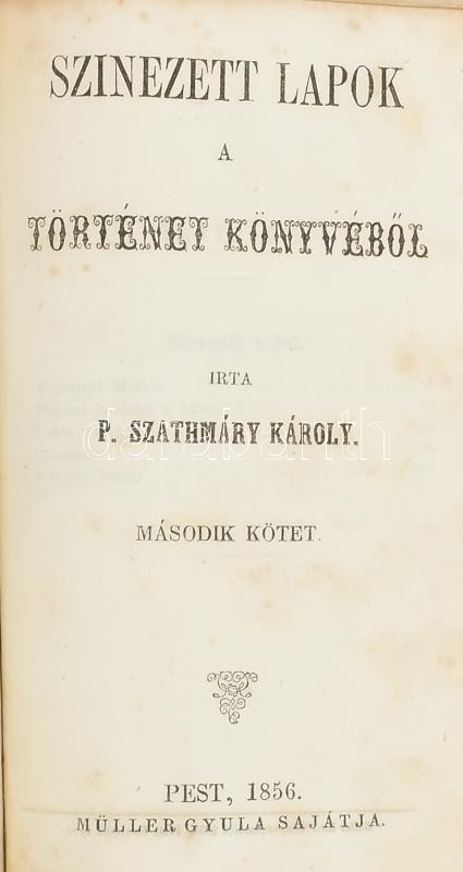 P. Szathmáry Károly: SzÃnezett lapok a történet könyvébÅ‘l. I-II. köt. [Egy kötetben]. Pest, 1856, Müller Gyula, (8)+255+(1) p., (8)+240 p. Korabeli egészvászon-kötésben, sérült, kissé foltos, kopott borÃtóval, helyenként kissé foltos lapokkal, az elsÅ‘ kötet cÃmlapján hiánnyal.