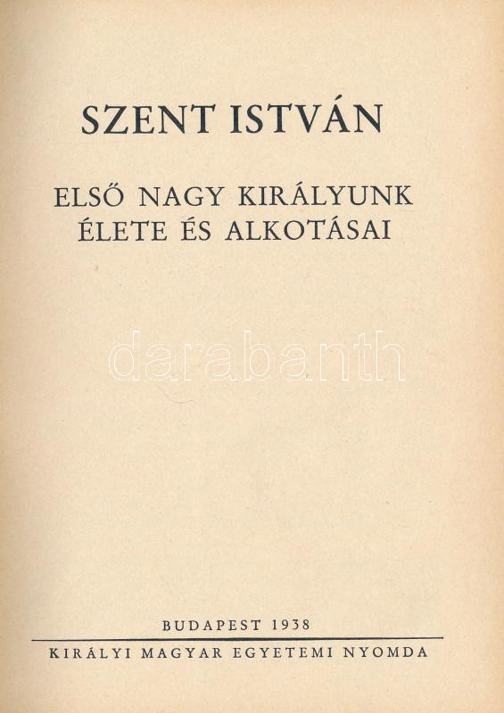 Szent István. Első nagy királyunk élete és alkotásai. Hóman Bálint, Csapody Csaba, Bakács István János, Nevelős Ágoston, Ember Győző, Belitzky János és Guillemot Katalin tanulmányai. Bp., 1938, Kir. M. Egyetemi Nyomda, 88+(8) p. Kiadói aranyozott, dombornyomott egészvászon-kötés, jó állapotban.