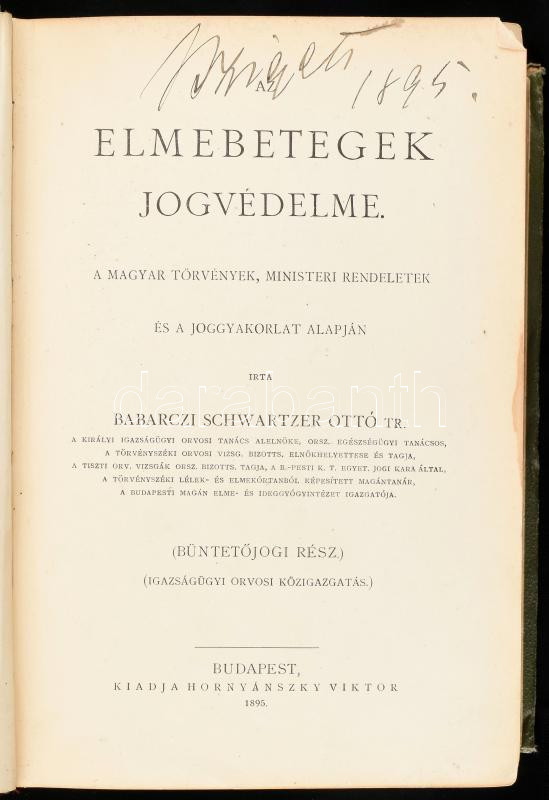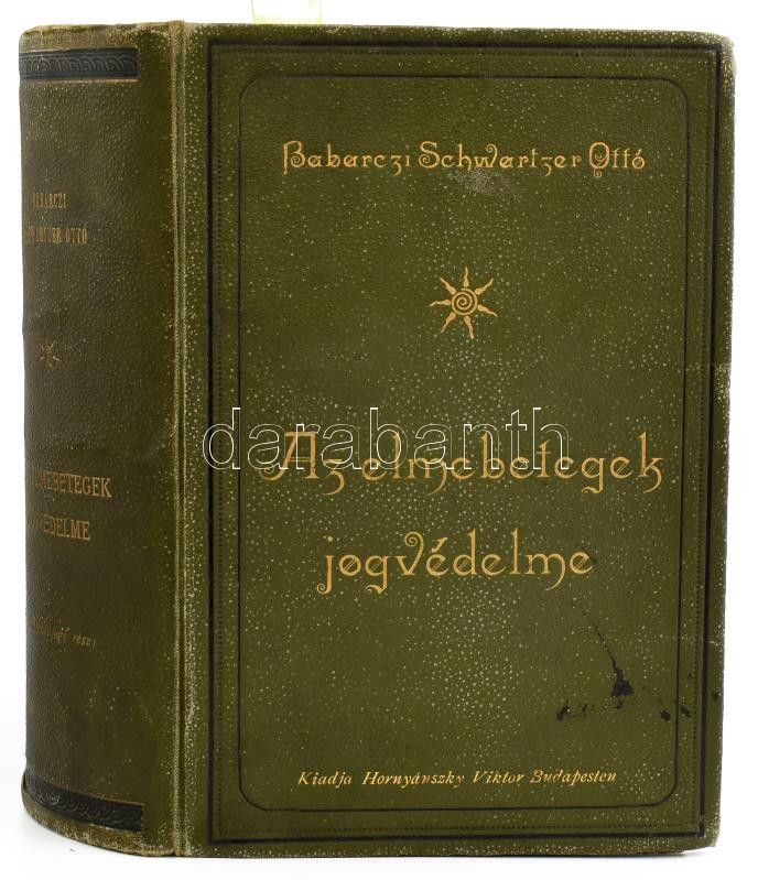 Babarczi Schwartzer Ottó: Az Elmebetegek jogvédelme. A magyar törvények, miniszteri rendeletek és a joggyakorlat alapján (Büntetőjogi rész.) (Igazságügyi orvosi közigazgatás). Bp., 1895, Hornyánszky Viktor. 1044 p. Dr. Bary József (1858-1915) m. kir. törvényszéki elnök, a tiszaeszlári vérvádper vizsgálóbírója hagyatékából. Előzéklapon fia, Bary Zoltán (1892-1986) korábbi kir. főügyész helyettes autográf ajándékozási soraival Gellért György (1911-2013) jogász, a Legfelsőbb Bíróság elnökhelyettese részére. Kiadói aranyozott egészvászon kötés, márványozott lapélekkel, gerincen apró sérüléssel, kissé kopott borítóval, kissé sérült kötéssel.