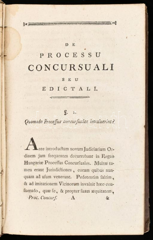 [Kéler Zsigmond (1742-1809)] Sigismundo Kéler: Tractatus practicus de processu concursuali secundum ordinem judiciarium pro regno Hungariae partibusque eidem ednexis benigne praesciptum instituendo. Autore - - regio riscali procuratore. Viennae, 1786., Typis Josephi Hraschanazky, 8 sztl. lev. + 256 p. Korabeli kartonált papírkötés, kopott, foltos, sérült borítóval, foltos lapokkal.