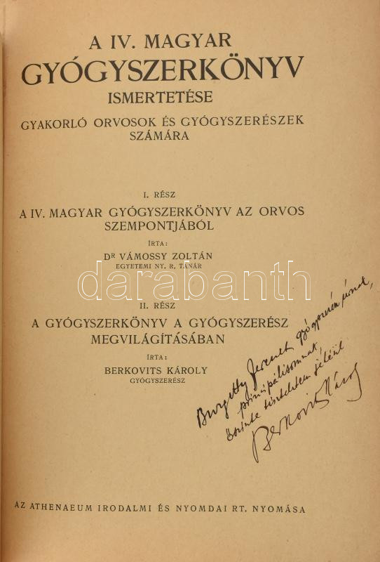 A IV. magyar gyógyszerkönyv ismertetése gyakorló orvosok és gyógyszerészek számára. I. rész: Vámossy Zoltán: A IV. magyar gyógyszerkönyv az orvos szempontjából. II. rész: Berkovits Károly: A gyógyszerkönyv a gyógyszerész megvilágításában. Az egyik szerző, Berkovits Károly által DEDIKÁLT példány. Bp.,én.,Athenaeum. Kiadói papírkötés, szakadt, sérült borítóval.