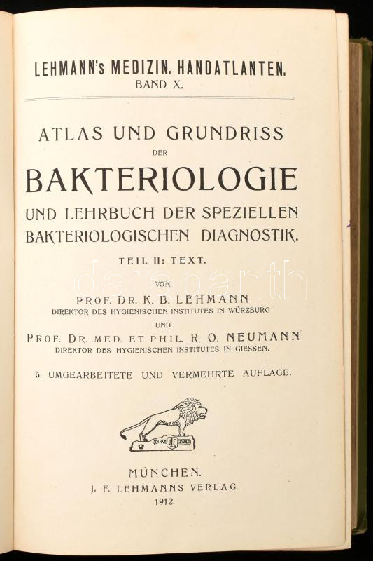 K. B. Lehmann - R. O. Neumann: Atlas und Grundriss der Bakteriologie und Lehrbuch der speziellen bakteriologischen Diagnostik. I-II. Teil I: Atlas. Teil II: Text. von Dr. - - - und Prof. Dr. Med. et Phil. - - -. Lehmann's Medizinische Handatlanten. Band X. München, 1910., J. F. Lehmanns Verlag. Német nyelven. Az I. kötet litografált képtáblákkal gazdagon illusztrált. Kiadói aranyozott egészvászon-kötés, festett felső lapélekkel illusztrált, kissé kopott, kissé foltos borítóval, a II. kötet alsó lapélei foltosak.