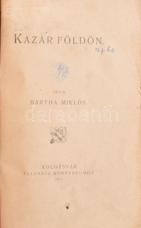 Bartha Miklós: Kazár földön. Kolozsvár, 1901., Ellenzék,2+328 p. Első kiadás. Átkötött félbőr-kötés, kopott borítóval, sérült gerinccel és kötéssel,a címlapon folttal, alatta átütő sorokkal, névbélyegzővel, részben felvágatlan lapokkal, megviselt állapotban. Antiszemita színezetű regény, ami a maga korában jelentős vitákat váltott ki.