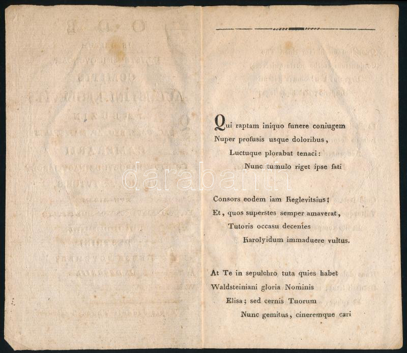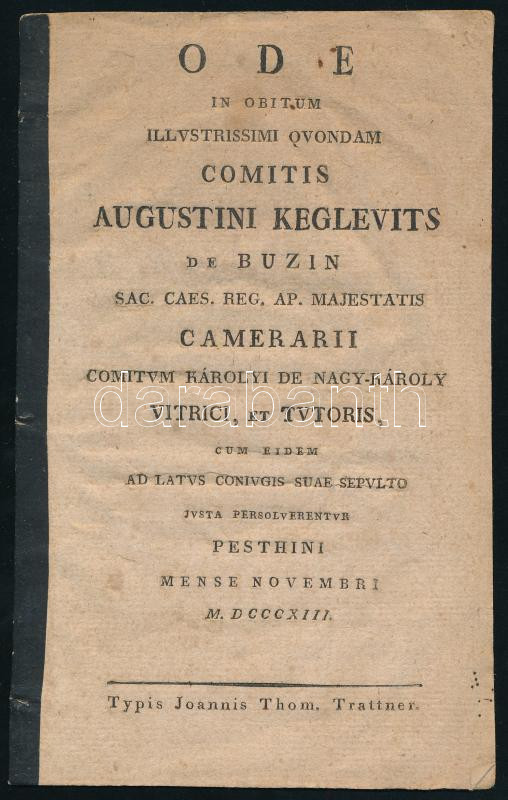 [Elenyák György (1784-1853)]: Ode in obitum illustrissimi quondam comitis Augustini Keglevits de Buzin Sac. Caes. Reg. Ap. Majestatis camerarii comitum Károlyi de Nagy-Károly vitrici, et tutoris, cum eidem ad latus coniugis suae sepulto iusta persolverentur Pesthini mense Novembri M.DCCCXIII. Pesthini, 1813, Typis Joannis Thom. Trattner, 9 p.