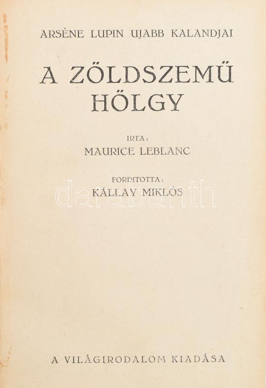 Leblanc, Maurice: A zöldszemű hölgy. Arséne Lupin újabb kalandjai. Bp.... https://www.darabanth.com/en/436-Online-auction/436.0/Books/Books-Other-rarities~1000023/Leblanc-Maurice-A-zoldszemu-holgy-Arsene-Lupin-ujabb-kalandjai-Bp-Vilagirodalom-Antik-f~II2828952