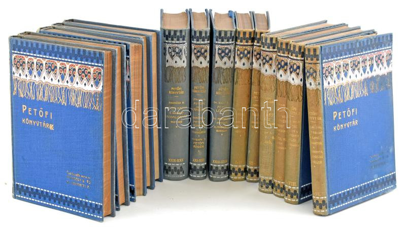 Petőfi-Könyvtár 14 kötete: I-II., III-IV., V-VI., VII-VIII., IX-X., XI-XII., XIII-XIV., XV-XVI., XVII-XVIII., XXI-XXII., XXIII-XXIV., XXV-XXVI., XXVII-XXVIII., XXIX-XXX. füzetek. Szerk.: Endrődi Sándor és dr. Ferenczi Zoltán. Bp., 1908-1911, Kunossy, Szilágyi és Társa. Kiadói dekoratív, aranyozott, festett egészvászon sorozatkötésben, vegyes állapotban.