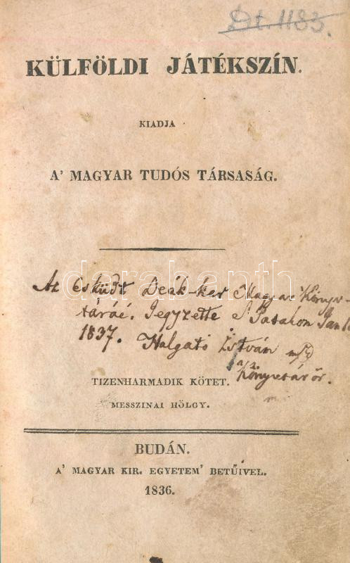 Description: Schiller, [Friedrich]: Messzinai hölgy. Szomorújáték öt felvonásban. Fordítá Szenvey József. Külföldi Játékszín. Tizenharmadik kötet. Kiadja a' Magyar Tudós Társaság. Budán, 1836., A' Magyar Kir. Egyetem' betűivel, 201+1 p. Első magyar kiadás. Átkötött modern kartonált papírkötés, régi könyvtári bélyegzéssel, 1837-es possessori bejegyzéssel.
