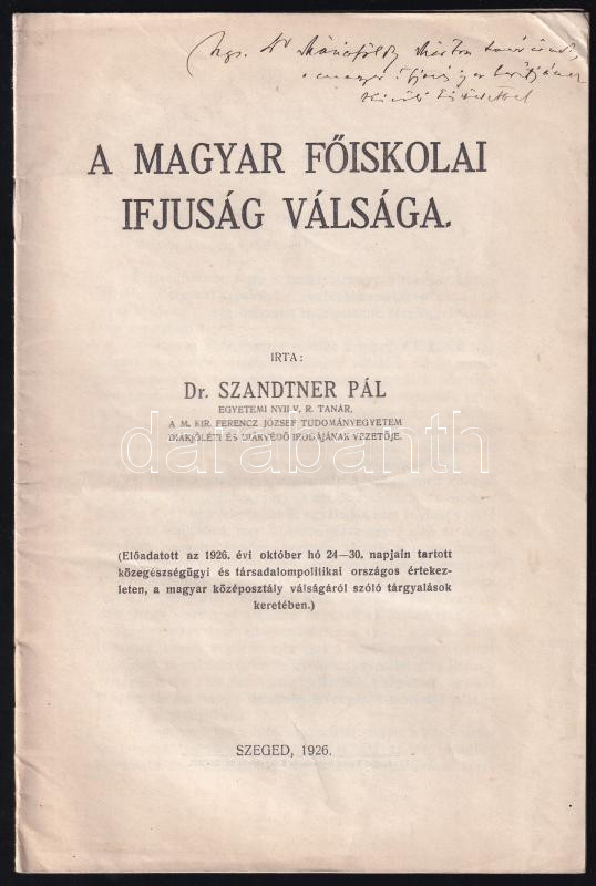 dr. Szandtner Pál: A magyar főiskolai ifjuság válsága. Dedikált. Szeged, 1926. 22p