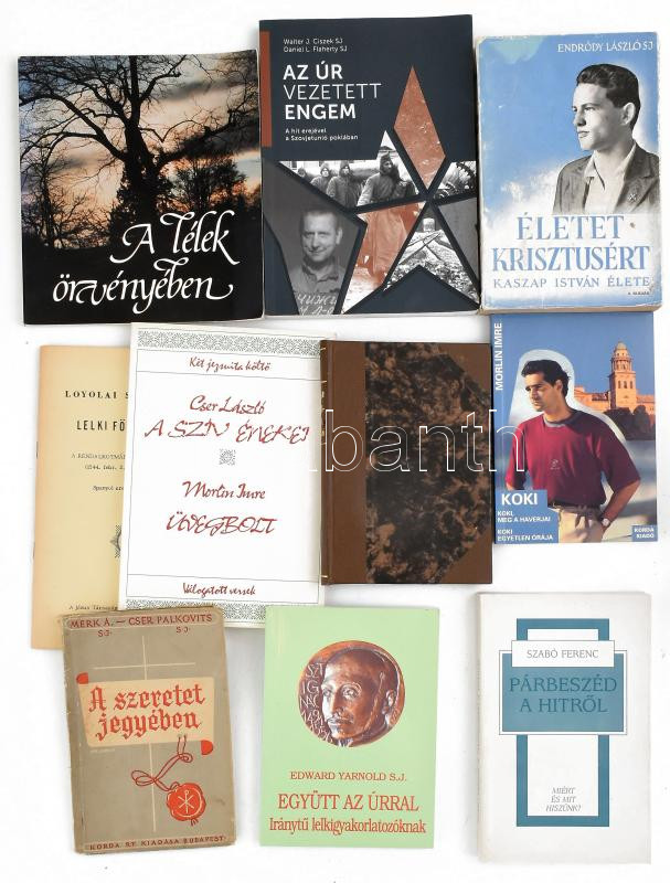 10 db jezsuita szerzetesrenddel kapcsolatos könyv: Az Úr vezetett engem - A hit erejével a Szovjetunió poklában; Loyolai Szent Ignác lelki följegyzései; Életet Krisztusért - Kaszap István élete; A lélek örvényében; Szabó Ferenc: Párbeszéd a hitről; Együtt az Úrral - Iránytű lelkigyakorlatozóknak; A szeretet jegyében; Morlin Imre: Koki; Krisztus útján - A katholikus akció főelvei; Két jezsuita költő (Cser László - Morlin Imre). Vegyes állapotban.