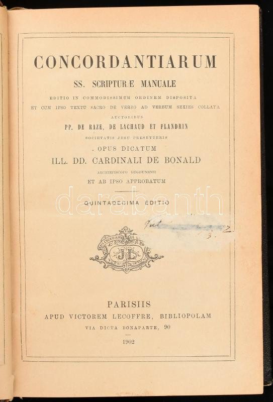 Description: Concordantiarum ss. scripturae manuale. Editio in commodissimum ordinem disposita; et cum ipso textu sacro de verbo ad verbum sexies collata. Parisiis, 1902, Lecoffre, VIII+751 p. Latin nyelven. テ》kテカtテカtt, bordテ。zott gerincナア egテゥszvテ。szon-kテカtテゥsben, kopott, kissテゥ sテゥrテシlt gerinccel.