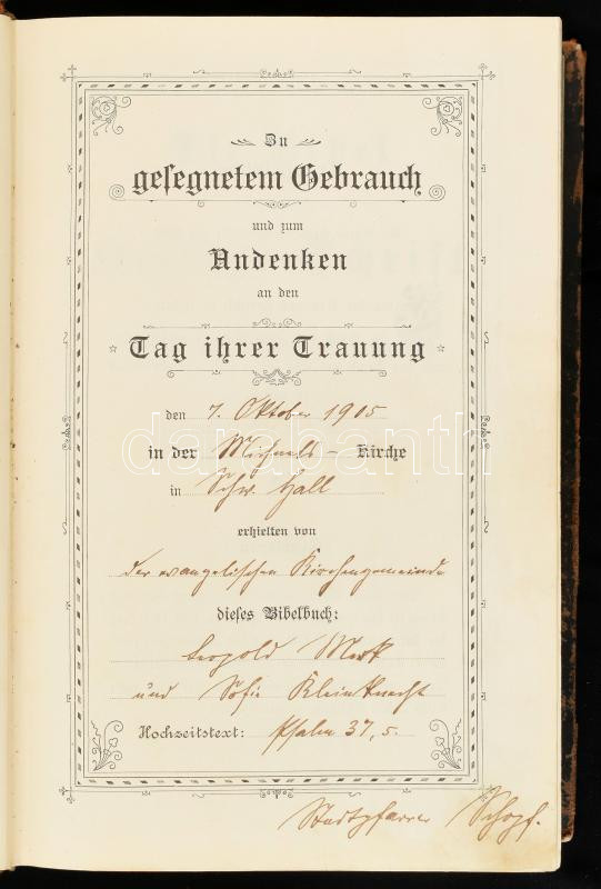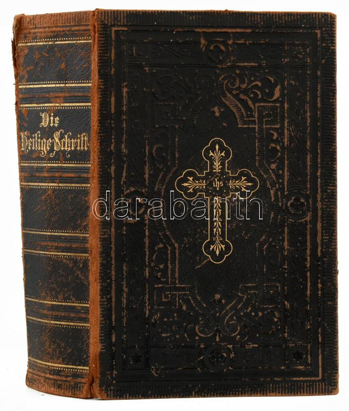 Die Bibel, oder die ganze Heilige Schrift des alten und neuen Testaments. Nach der deutschen Übersetzung Dr. Martin Luthers. Stuttgart, 1905, Priviligierte Württembergische Bibelanstalt. 23. kiadás. 8 színes táblával (színes térkép melléklet) Könyvkötői, dombornyomott korabeli egészbőr kötés aranyozott gerinccel és borítóval, gerince sérült, megerősített kötéssel, néhány kevés lapon ceruzás jegyzetekkel.