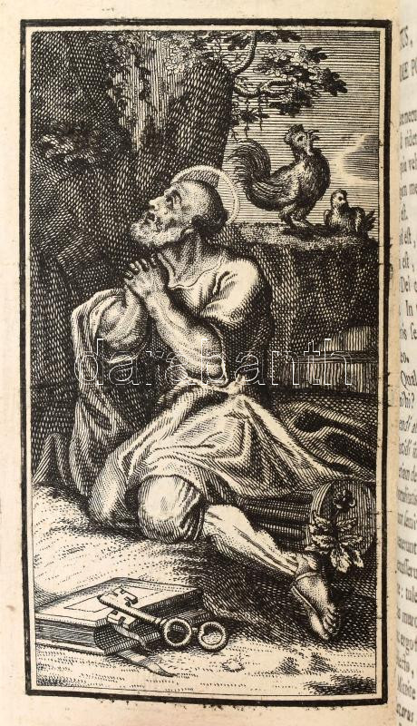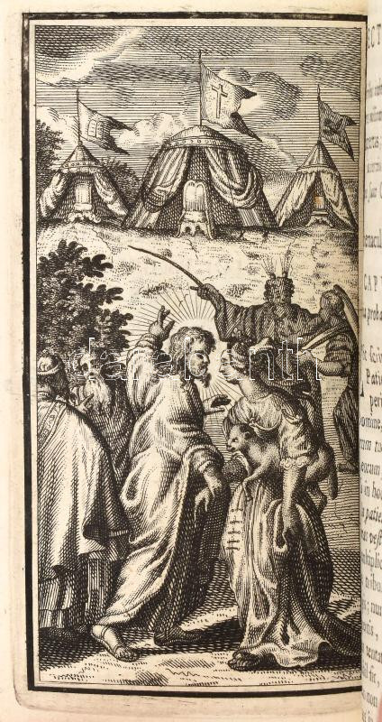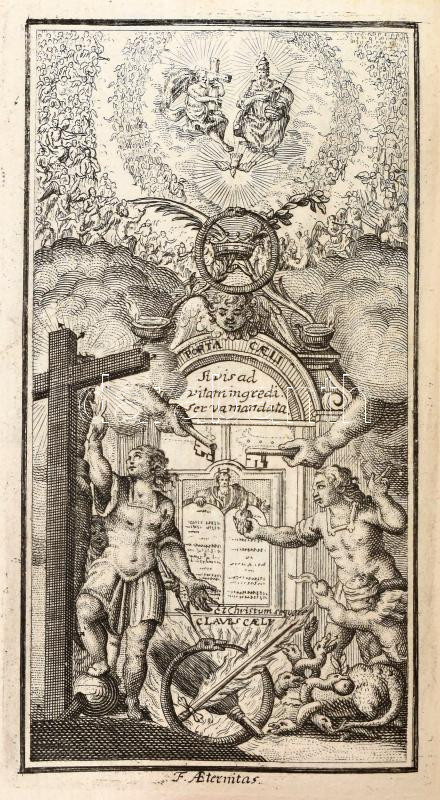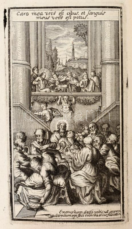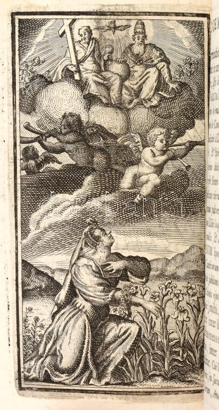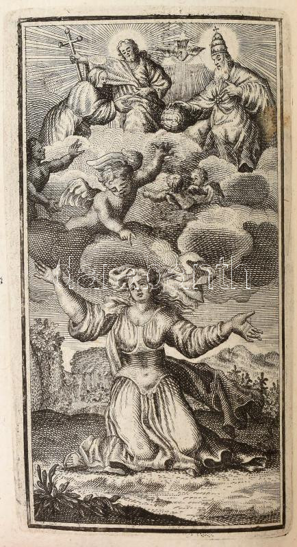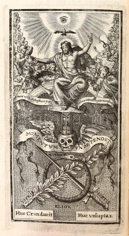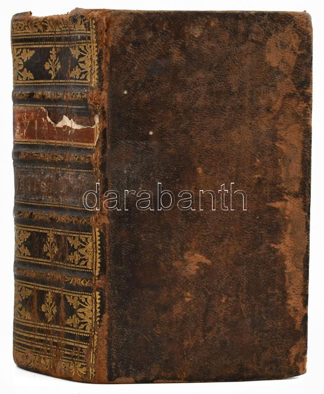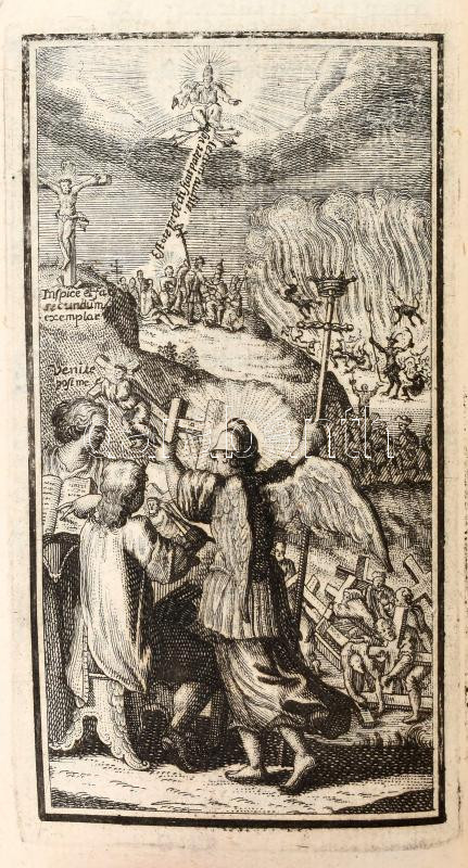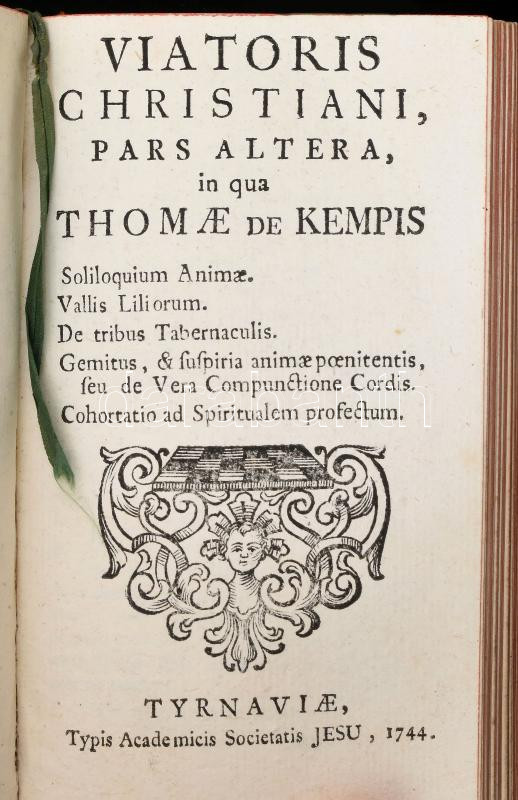 [Kempis Tamás/Thomas á Kempis (cca 1380-1471)]: Thomae de Kempis: Viator christianus recta ac regia in coelum cia tendens, ductu Thomae de Kempis, cujus de imitatione Christi, aliaque pissima Opuscula nová curá recensuit, et notis illustravit Jacobus Merlo Hostius, B. Mariae in Pasculo Pastor. I-II. köt. [Egybekötve.] Tyrnaviae [Nagyszombat], 1844., Typis Academicis Societatis Jesu, 1 (címkép) t.+27 sztl. lev. +2+338 p.+6 sztl. lev.; 418 p. + 3 sztl. lev. A címképpel együtt összesen 9 egészoldalas rézmetszettel. Latin nyelven. Korabeli aranyozott, bordázott gerincű egészbőr-kötés, kopott borítóval, a gerincen kis sérüléssel, a gerincen a címke kissé hiányos, régi intézményi bélyegzéssel.