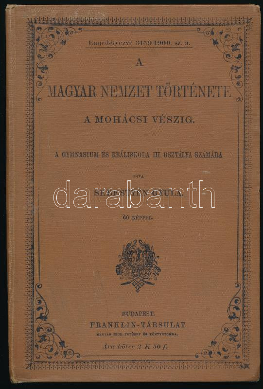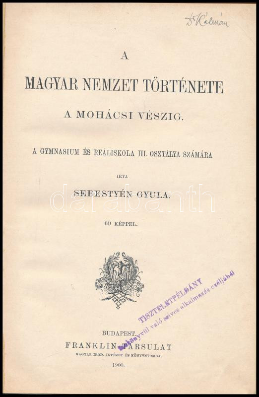 Sebestyén Gyula: A magyar nemzet története a mohácsi vésztől napjainkig. A gymnasium és reáliskola IV. osztálya számára. Bp., 1900, Franklin, IV+4+136 p.+4 t.(színes térképek, 2 db kétoldalas.) Szövegközti és egészoldalas képekkel illusztrált. Kiadói kissé kopott egészvászon-kötés, címlapon tiszteletpéldány bélyegzővel, helyenként firkált lapokkal, kissé sérült kötéssel, két lap kijár.