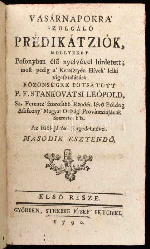 Stankovátsi Leópold: Vasárnapokra szolgáló prédikátziók, mellyeket Posonyban élő nyelvével hirdetett; most pedig a' keresztyén hívek' lelki vígasztalására botsátott P. F. - -. Második esztendő. Első része. Győr, 1790, Streibig József betűivel, 516+4 p. Korabeli félbőr-kötés, kopott borítóval és gerinccel, possessori bejegyzéssel, régi intézményi bélyegzéssel. Stankovátsi Lipót (1742 -1789) ferences szerzetes, hitszónok és hittérítő.