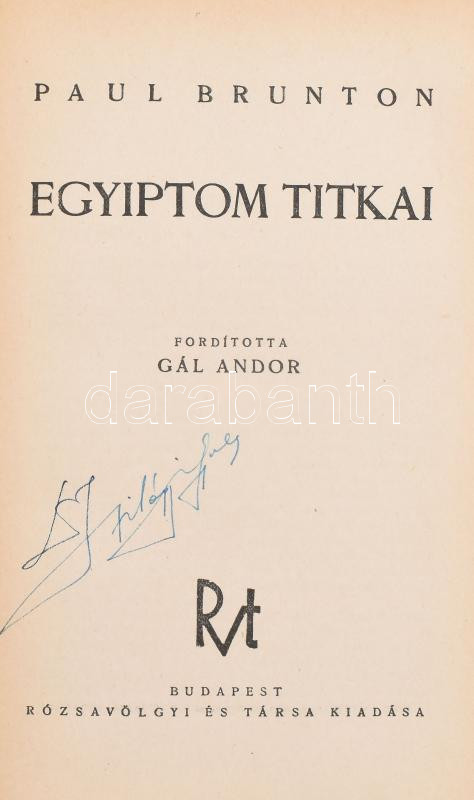 Brunton, Paul: Egyiptom titkai. Ford.: Gál Andor. Bp., [1940], Rózsavö... https://www.darabanth.com/en/436-Online-auction/436.0/Books/Books-Travelling-Local-History~1000005/Brunton-Paul-Egyiptom-titkai-Ford-Gal-Andor-Bp-1940-Rozsavolgyi-es-Tarsa-271-p-plus-X~II2835898