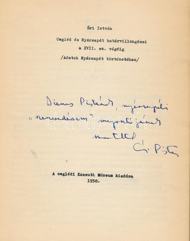 Éri István: Cegléd és Nyársapát határvillongásai a XVII. sz. végéig. (Adatok Nyársapát történetéhez.) A szerző, Éri István (1929-2009) történész, régész, muzeológus által Dienes István (1929-1995) régész, muzeológus részére DEDIKÁLT példány. Ceglédi Füzetek 4. sz. Cegléd, 1958, Kossuth Múzeum, 44 p. Kiadói papírkötés. Megjelent 350 példányban .Ritka!