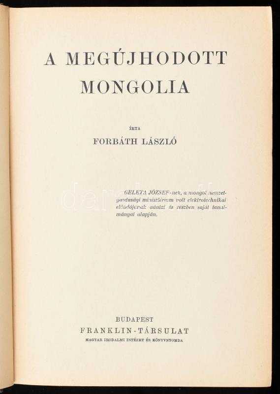 Forbáth László: A megújhodott Mongolia. A Magyar Földrajzi Társaság Kö... https://www.darabanth.com/en/436-Online-auction/436.0/Books/Books-Travelling-Local-History~1000005/Forbath-Laszlo-A-megujhodott-Mongolia-A-Magyar-Foldrajzi-Tarsasag-Konyvtara-Budapest-E~II2800349