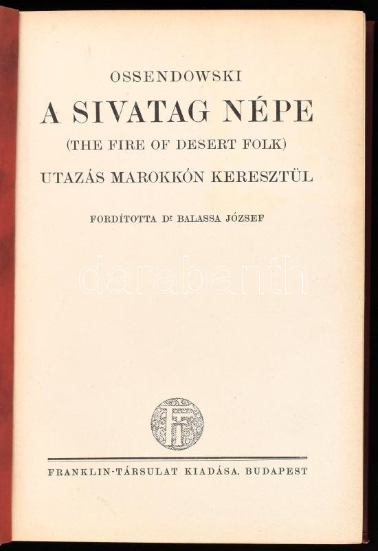 [Ossendowski, Ferdynand Antoni (1876-1945)]: Ossendowski: A sivatag népe. Ford.: Balassa József. Bp., [1926], Franklin-Társulat, 246+(1) p. Kiadói aranyozott egészvászon-kötés, ex libris-szel.