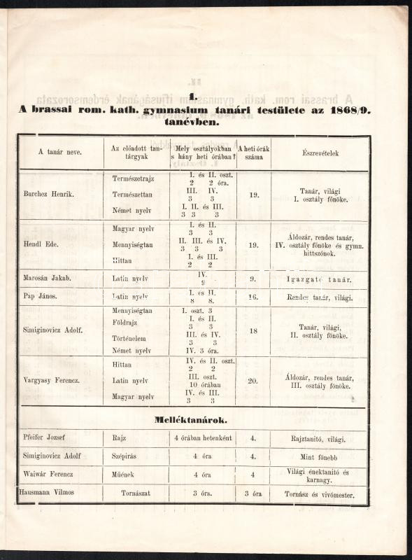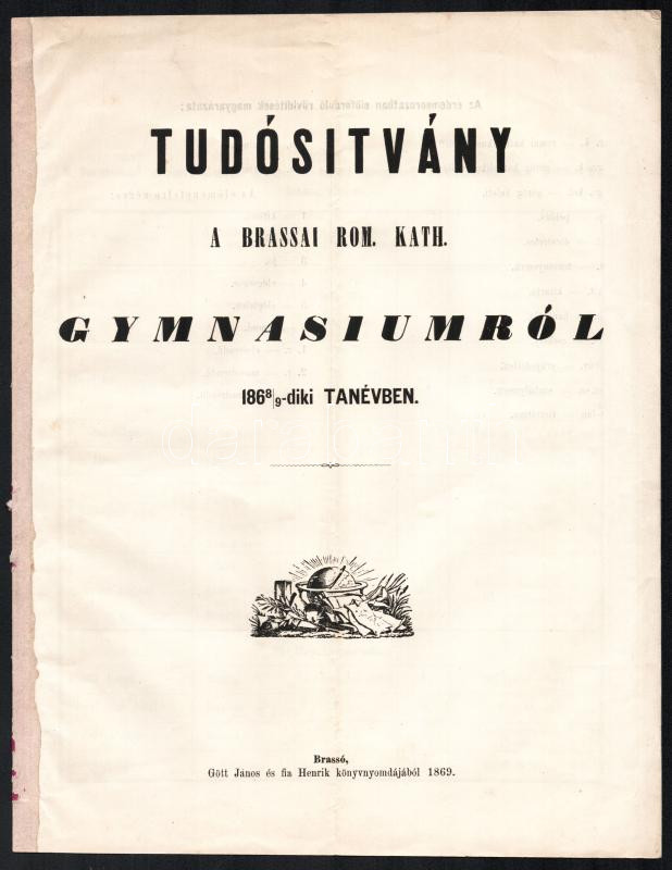Tudósítás a Brassai Rom. Kath. Gymnasiumról 1868/69-diki tanévben. Brassó, 1869, Gött János és Fia Henrik-ny., 7 p. Kiadói papírkötés, hajtott.