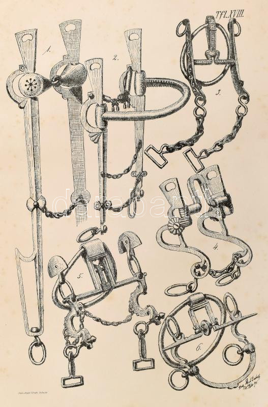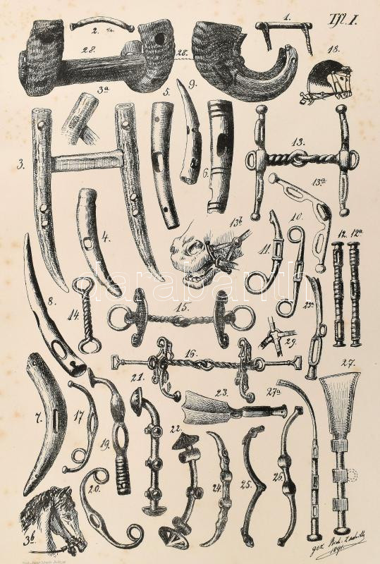 Description: Zchille R. & R. Forrer: Die Pferdetrense in ihrer formen-entwicklung. Berlin, 1893. Verlag von Paul Bette, 17 p. + 17 t (litográfiák) Folió. Későbbi félvászon kötésben. 46 cm / A lovak zablájáról szóló, ritka, képes kiadvány!