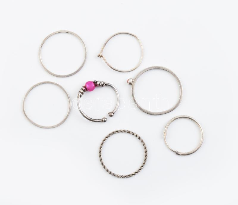 Ezüst(Ag) gyűrű, 6 db + 1 db fülkarika, jelzés nélkül, bruttó: 3,2 g