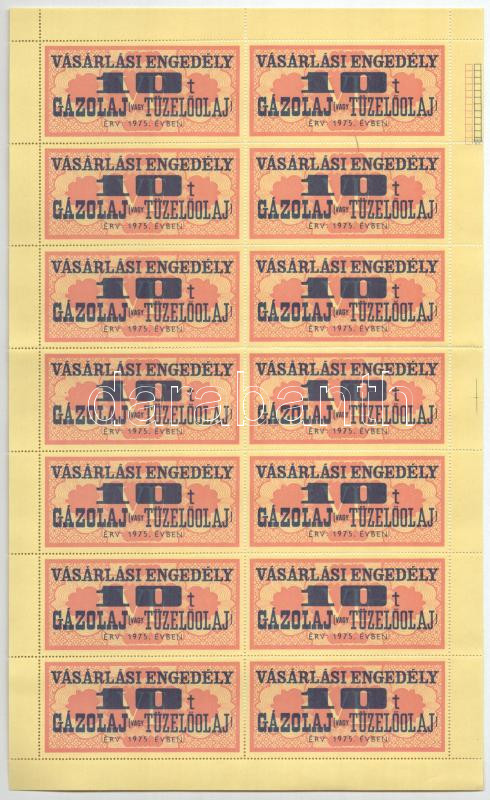1975. "Vásárlási engedély - 10T Gázolaj vagy Tüzelőolaj" (14x) bélyeg, teljes ív T:II
