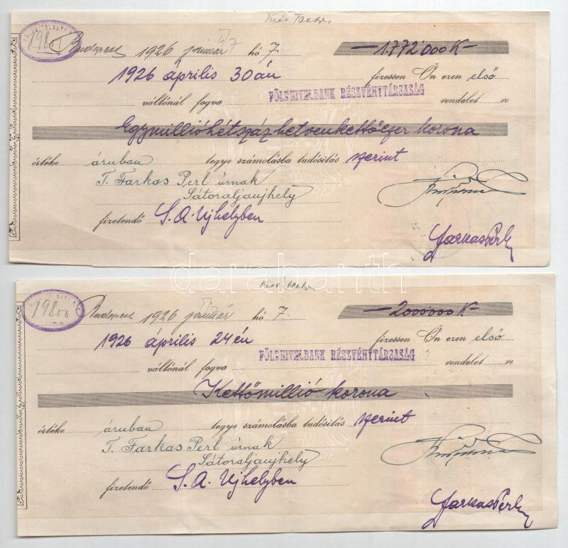 Budapest 1926. 4 darab "Földhitelbank Részvénytársaság" kitöltött váltó T:II,II- kis szakadás