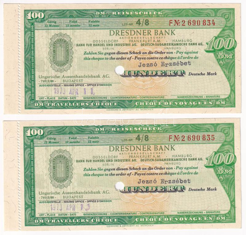 Németország / Drezda 1973. "Dresdner Bank" utazási csekk 100M értékben lyukasztással érvénytelenítve "F#2 690 834-F#2 690 835" sorszámkövető (2x) T:I-