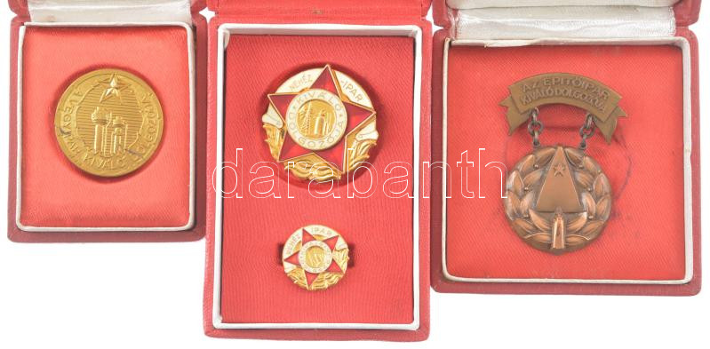 Description: ~1960. "Nehézipar Kiváló Dolgozója" műgyantás jelvény miniatűrrel, tokban (34mm) + "Vegyi Ipar Kiváló Dolgozója" Cu-Zn jelvény eredeti tokban (30mm) + "Az Építőipar Kiváló Dolgozója" bronz jelvény tokban (31mm) T:1