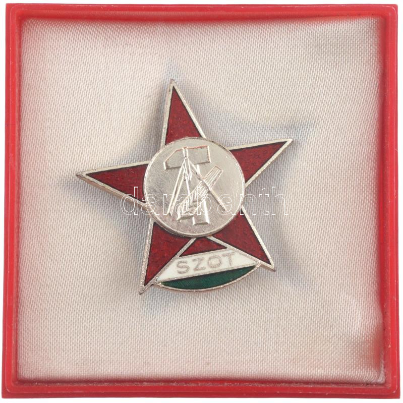 ~1960. "SZOT (Szakszervezetek Országos Tanácsa)" zománcozott fém kitüntető jelvény eredeti "SZOT" eredeti, SZOT-címeres tokban T:1,1-