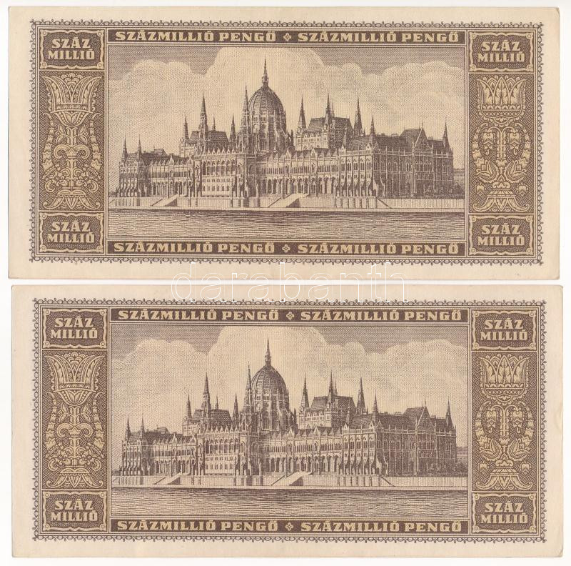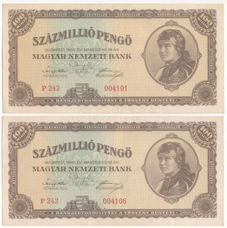 1946. 100.000.000P (2x) közeli sorszám "P 242 004101, P 242 00410...